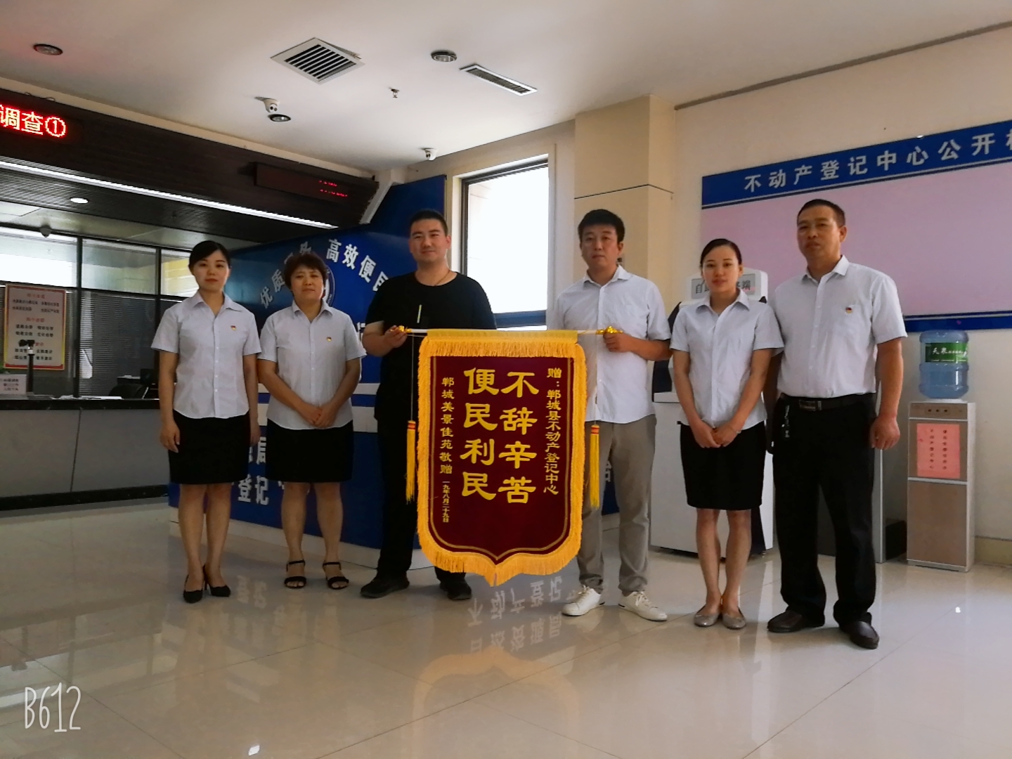 近日,河南博騏置業(yè)有限公司工作人員來到鄲城縣不動產(chǎn)登記中心,將一面印有“不辭辛苦,便民利民”的錦旗送到了中心負(fù)責(zé)人手中,對不動產(chǎn)登記中心真心為民的服務(wù)態(tài)度和高效的辦事效率表示感謝,點(diǎn)贊窗口“熱情、文明、高效”的服務(wù)。