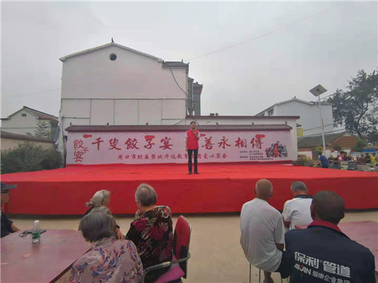 與此同時,在演出現(xiàn)場附近的村委大院內(nèi),由周口市慈孝文化促進(jìn)會、北斗達(dá)教育集團(tuán)等組成的200多名志愿團(tuán)隊正忙得不亦樂乎,調(diào)餡、包餃子、下鍋、端盤,兩個多小時內(nèi),他們精心包出20000多個愛心水餃。11時30分,餃子宴正式開始,老人們一邊吃著水餃一邊觀看者演出,喜笑顏開,呈現(xiàn)出一片相親相敬的溫馨畫面。