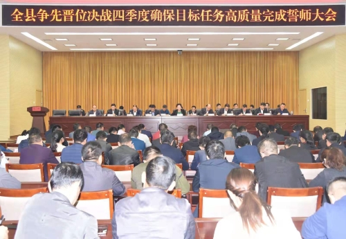 乘著周口市2019年第三季度項(xiàng)目觀摩的東風(fēng),扶溝吹響了決戰(zhàn)第四季度、奮力推動(dòng)經(jīng)濟(jì)社會(huì)高質(zhì)量發(fā)展的“沖鋒號(hào)”。10月21日,扶溝縣召開爭(zhēng)先晉位決戰(zhàn)四季度確保全縣目標(biāo)任務(wù)高質(zhì)量完成誓師大會(huì),深入貫徹習(xí)近平總書記在河南考察調(diào)研指示精神,動(dòng)員全縣上下進(jìn)一步認(rèn)清形勢(shì),堅(jiān)定信心,鼓足干勁,加大力度,大干苦干,決戰(zhàn)決勝,全力以赴做好第四季度工作,確保全年目標(biāo)任務(wù)高質(zhì)量完成。張穎波、詹凱、姜永來(lái)、張建中等縣四個(gè)班子領(lǐng)導(dǎo)出席會(huì)議。縣委副書記、政法委書記詹凱主持會(huì)議。