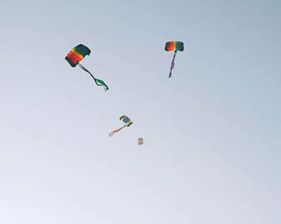 “看,跳傘表演開始了?!?0月29日上午,周口西華通用機場首航儀式結(jié)束后,一場精彩絕倫的飛行表演就開始了。載著跳傘運動員的飛機起飛到指定地點后,運動員攜帶著國旗和彩帶從高空中跳下,打開傘包后,空中五顏六色十分漂亮,引得圍觀群眾不時叫好。