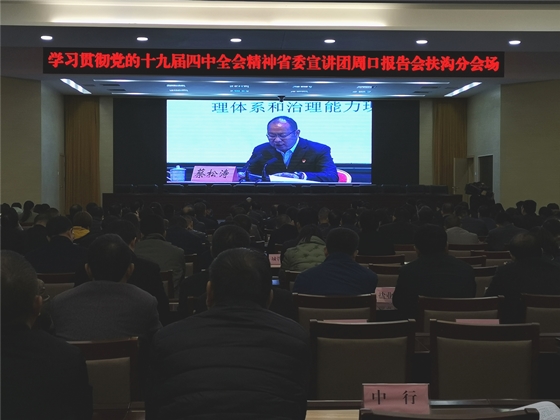 根據(jù)省委統(tǒng)一部署,11月27日,學(xué)習(xí)貫徹黨的十九屆四中全會精神省委宣講團報告會在周口市舉行,扶溝縣四個班子領(lǐng)導(dǎo)和縣直各單位負責(zé)人在扶溝分會場聆聽宣講報告。