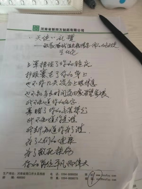 “阻擊疫情的陣容里你默默奉獻(xiàn)著熱和光你舍棄小家 顧著大家 心似蓮花 情滿海洋”1月30日,50多歲愛好寫詩(shī)的周口市民王化民致電記者,為了表達(dá)對(duì)奮戰(zhàn)在疫情一線白衣天使的崇敬,他特意寫了一首詩(shī)歌來(lái)禮贊。