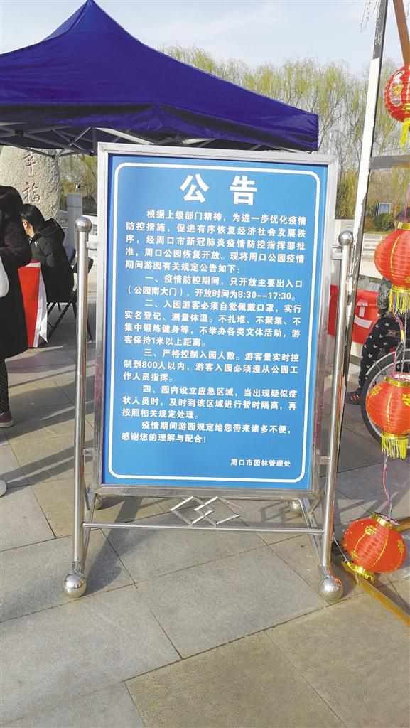 當(dāng)日上午10時(shí)許,記者在周口公園看到,在南門入口處的醒目位置,擺放著一個(gè)公告牌,寫有入園須知,上面顯示疫情防控期間的開園時(shí)間為8:30~17:30,不少游客駐足觀看。入口處,周口市園林管理處疫情防控宣傳臺(tái)前的工作人員正忙碌著。游客需間隔1米距離排隊(duì),經(jīng)測(cè)量體溫、登記身份證號(hào)、雙手噴灑酒精后方可進(jìn)園。雖然入園程序有點(diǎn)繁瑣,但是游客都非常配合。