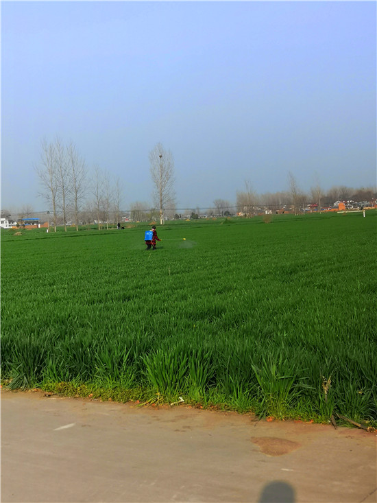 3月10日,沈丘縣老城鎮(zhèn)南關(guān)村村民在麥田里噴灑除草劑。