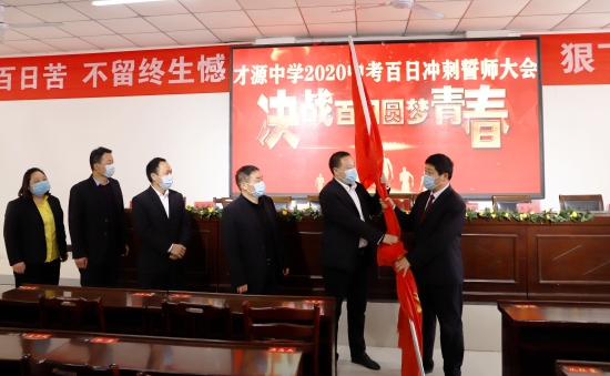 誓師大會(huì)現(xiàn)場,才源中學(xué)校長張醒民向九年級階段負(fù)責(zé)人授戰(zhàn)旗。師生代表面對直播鏡頭向全體初三師生發(fā)出鏗鏘誓言,號召大家奮勇爭雄,2020年再奪中考全市領(lǐng)先的佳績。誓詞為:凌志擎天,豪氣滿懷;天道酬勤,樂戰(zhàn)不?。灰鈭?jiān)心恒,信念常在;以我雄心,征戰(zhàn)未來;沖刺百日,只為無悔青春;人生綻放,定是風(fēng)雨兼程;今日苦讀書厲兵秣馬,明朝進(jìn)重點(diǎn)吐氣揚(yáng)眉。