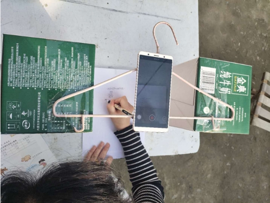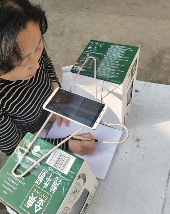 在備課時,朱霞很快遇到了難題:手機(jī)沒法固定,街上手機(jī)店又全部停業(yè),網(wǎng)上買的手機(jī)固定夾發(fā)不了貨。為了不耽誤學(xué)生上課,她想到用晾衣?lián)巍⑴D滔渥龀珊喴字Ъ?,組裝后居然效果不錯。就這樣,一個晾衣?lián)巍蓚€牛奶箱和一部手機(jī)組成了她的“三尺講臺”。