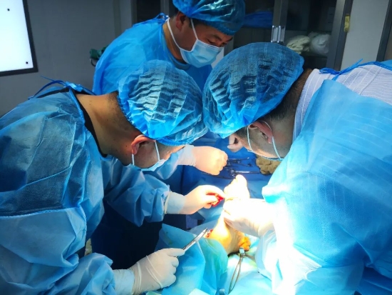 患者,張某,男,64歲,巴集鄉(xiāng)曹集行政村人。因下肢開(kāi)放足損傷,到巴集鄉(xiāng)衛(wèi)生院就診。由于患者年紀(jì)大、病情急,巴集鄉(xiāng)衛(wèi)生院人員技術(shù)能力有限,接診醫(yī)師告知需到縣級(jí)醫(yī)院進(jìn)行手術(shù)?;颊呒覍僬f(shuō)家庭困難,各項(xiàng)開(kāi)支大,請(qǐng)求能不能讓專家到下面開(kāi)展手術(shù)。接診醫(yī)師報(bào)醫(yī)共體辦公室聯(lián)系集團(tuán)總院,集團(tuán)總院立即組織幫扶專家團(tuán)隊(duì)。晚9點(diǎn),以集團(tuán)總院副院長(zhǎng)于祖河、骨科主治醫(yī)師王鑫和巴集鄉(xiāng)衛(wèi)生院外科主任楊志遠(yuǎn)、外科副主任王山嶺的協(xié)助下,成功地為張某行肌腱吻合、神經(jīng)探查、趾骨骨折內(nèi)固定術(shù)。目前,患者生命體征平穩(wěn),恢復(fù)良好。