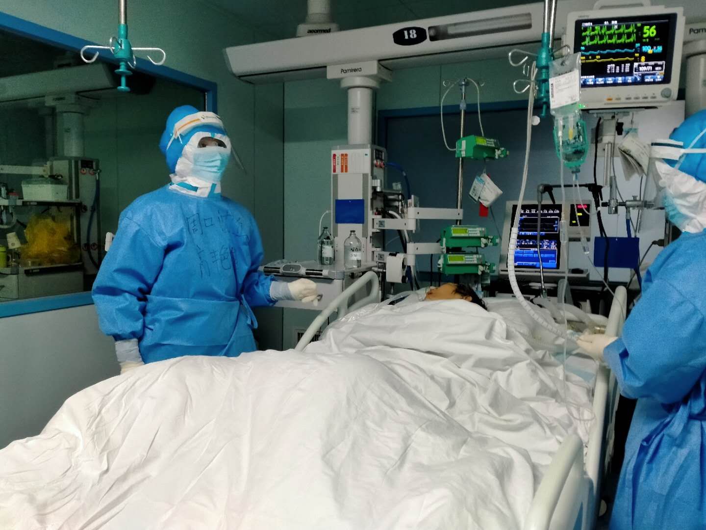 高艷艷說,除了多穿一層防護(hù)服,其他的跟平時的工作差不多。不同的地方,主要體現(xiàn)為兩點(diǎn),一就是從接班到交班,所做的所有工作都多了一份被感染的風(fēng)險。二就是救治存在的難點(diǎn)多、棘手的問題多、突發(fā)事件比較多,比如說:新冠肺炎患者發(fā)展到危重期,特別是病程較長的病人,肺大多爛掉了,多數(shù)病人上有呼吸機(jī),這樣的病人極易出現(xiàn)氣胸。有一次值班期間,一位56歲的男性患者,突發(fā)氧分壓下降、煩躁、血壓下降、出汗,急查胸片證實(shí)氣胸,緊急給予了胸腔穿刺閉式引流,病人癥狀才得以緩解。氣胸雖然在臨床上很常見,但對于新冠肺炎病人卻如同雪上加霜,不緊急處理病人很快就會死掉。每一個搶救的場面如同一場激烈的戰(zhàn)場,而戰(zhàn)斗隨時會打響,但你卻根本無法預(yù)測哪一次戰(zhàn)斗會在哪一個時刻打響,所以值班時每位醫(yī)師都會慣性地緊盯著每個數(shù)值、各個參數(shù)……