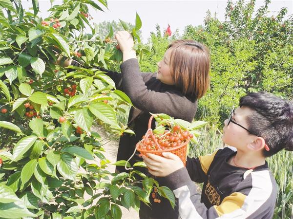 4月26日,在淮陽區(qū)豆門鄉(xiāng)武灣村的櫻桃采摘園內(nèi),人們享受著采摘的樂趣。武灣村農(nóng)民利用地理優(yōu)勢(shì)種植櫻桃、草莓等,吸引附近的民眾前來采摘,成為當(dāng)?shù)氐奶厣a(chǎn)業(yè)。記者 孫安平 攝