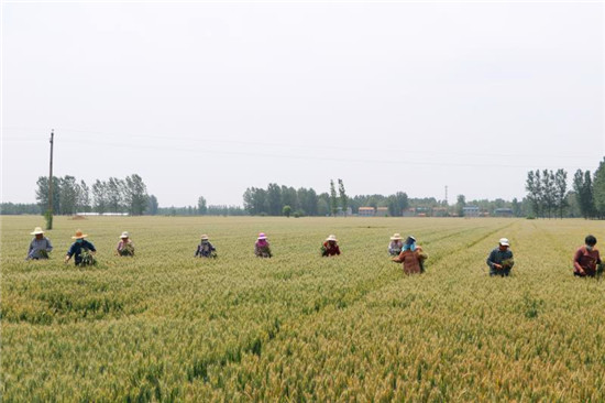 5月16日,記者在鹿邑縣棗集農(nóng)場(chǎng)看到,2800多畝的良種小麥繁育基地里50多人分成四支隊(duì)伍一字排開(kāi),在綠波碧浪的小麥田里認(rèn)真排查、進(jìn)行提質(zhì)去雜工作。