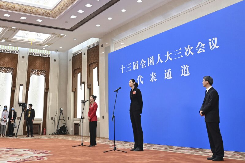 5月22日,第十三屆全國人民代表大會第三次會議舉行首場“代表通道”采訪活動。這是全國人大代表朱婷(右二)通過網(wǎng)絡(luò)視頻方式接受采訪。新華社記者 劉金海 攝