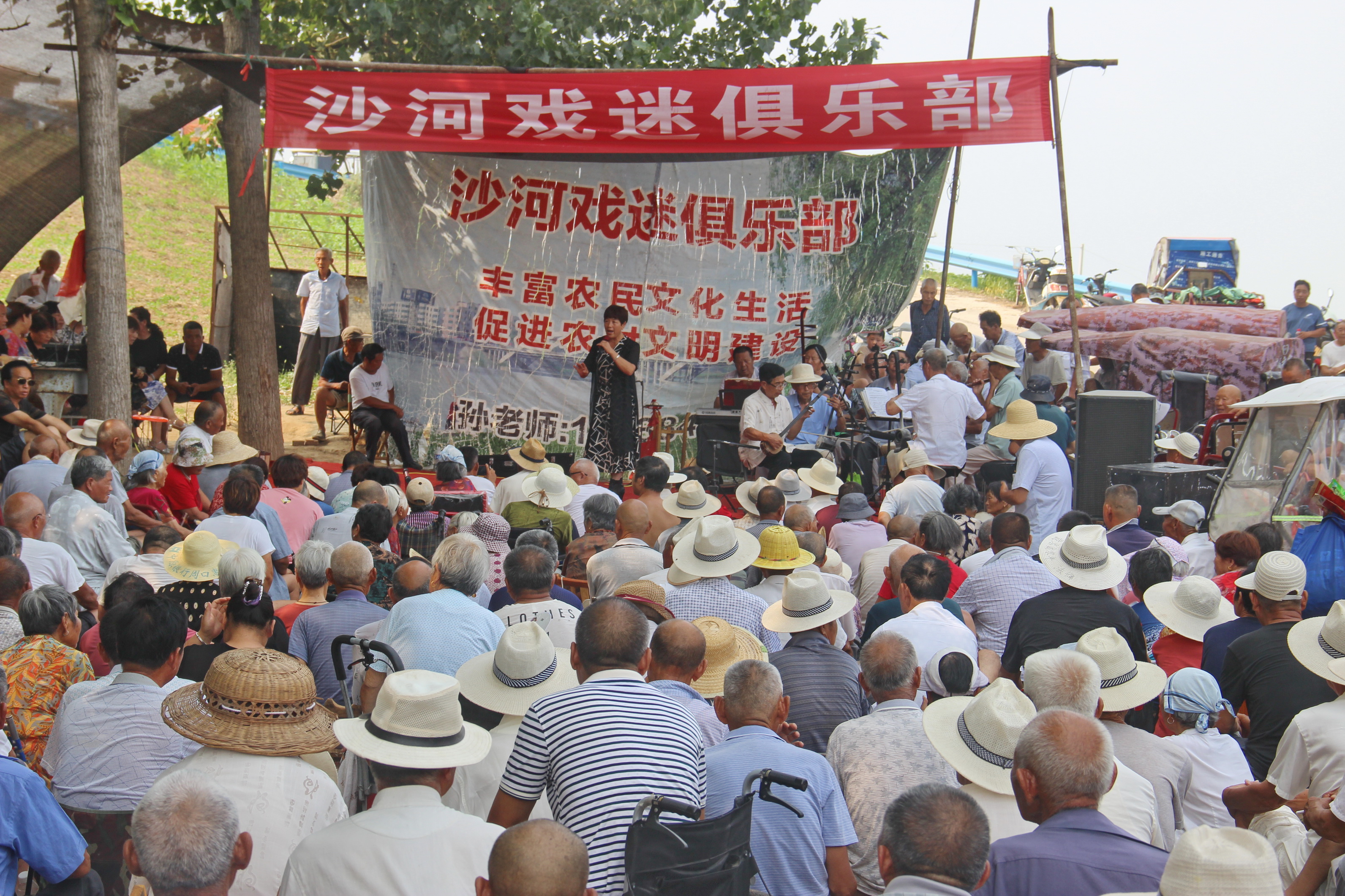 商水縣郝崗鎮(zhèn)大路李村位于漯河郾城、西華、商水三地交界之處,因該村臨近沙河,周邊十多個(gè)鄉(xiāng)鎮(zhèn)的文藝愛好者自發(fā)組建了沙河戲迷俱樂部。該俱樂部每周三、周六在河堤樹林中等地方舉辦兩場戲曲演唱會(huì)。演員來自周邊附近的戲迷愛好者,有唱常派的、閆派的、崔派的、豫東調(diào)的等,后臺樂隊(duì)也是有民間文藝愛好者自帶樂器免費(fèi)表演,主持人由退休老教師、老干部組成,加上群眾捐款捐物幫助俱樂部添置音響等設(shè)備,目前在郝崗鎮(zhèn)文化部門的指導(dǎo)下該俱樂部已舉辦48期,成為周邊群眾才藝表演的好地方。