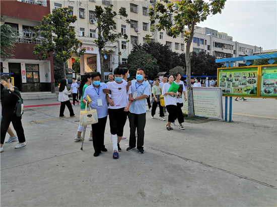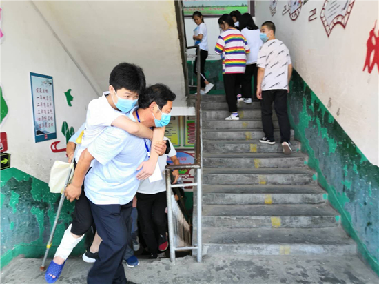 “終于到了,要不是身體好,還真不能一口氣把這孩子背上三樓。”鄲城縣第三實(shí)驗(yàn)中學(xué)考務(wù)老師張子江邊擦汗邊笑著說(shuō)。