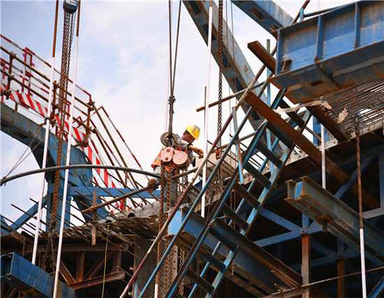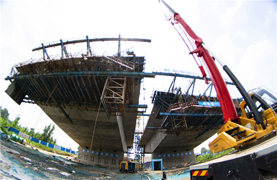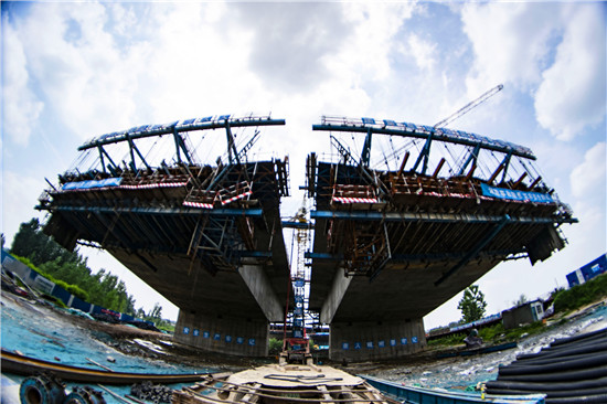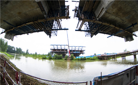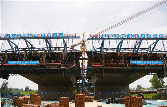 周口北環(huán)跨賈魯河大橋是我市在建重點工程,全長904米,其中主橋總長286米,共3跨,采用懸澆法施工。7月16日中午,記者在工地看到,經(jīng)過一年多的施工,工程完成80%左右,為了保障工期和質(zhì)量,工人們冒著酷暑,在跨河的兩列橋墩上,忙碌著澆鑄施工,隨著澆鑄橋體的延伸,預計年底橋體完成合攏。
