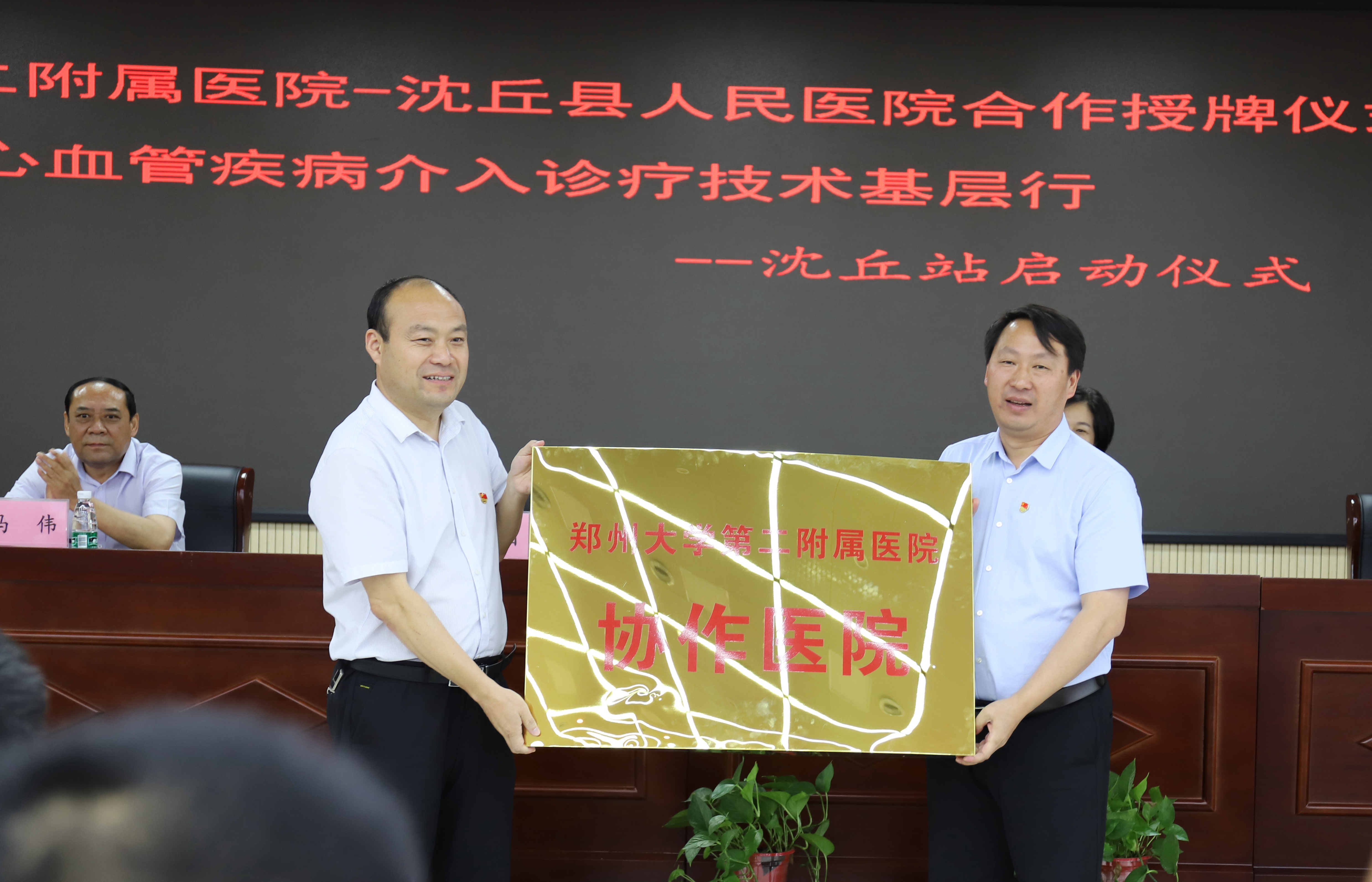 隨后,鄭大二附院副院長簡立國為沈丘縣人民醫(yī)院授協(xié)作醫(yī)院牌。沈丘縣人民醫(yī)院院黨委書記歐陽劍為鄭大二附院的簡立國院長及心血管內(nèi)科各位教授專家頒發(fā)特聘專家證書。沈丘縣衛(wèi)健委張治君在總結(jié)講話中指出,縣醫(yī)院與鄭州大學(xué)第二附屬醫(yī)院建立友好協(xié)作關(guān)系,不僅對(duì)縣醫(yī)院是個(gè)很好的發(fā)展機(jī)遇,也是該縣醫(yī)療衛(wèi)生工作走大靠強(qiáng)道路的具體體現(xiàn),是醫(yī)療衛(wèi)生戰(zhàn)線上的一件大喜事,對(duì)加快醫(yī)療衛(wèi)生事業(yè)發(fā)展,有效的解決廣大人民群眾看病貴、就醫(yī)難的問題,將起到積極的推動(dòng)作用。希望鄭州大學(xué)第二附屬醫(yī)院的領(lǐng)導(dǎo)和專家們常來指導(dǎo),兩家醫(yī)院能夠友好協(xié)作,共同發(fā)展。