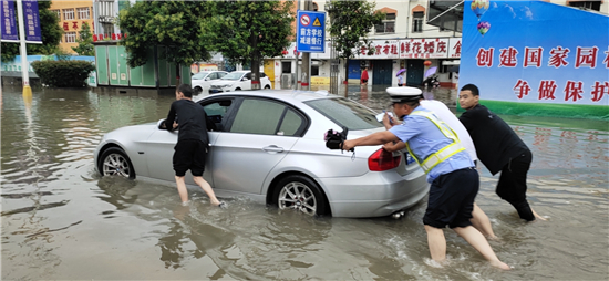 推車、砍樹、疏導(dǎo)……直屬各大隊民警分赴市區(qū)眾多積水路口路段,或冒雨指揮交通、或徒手清理下水道堵塞物及路面雜物、或在水深過膝路段幫助老人和小孩過馬路。