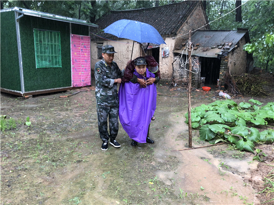 強(qiáng)降雨導(dǎo)致部分地勢較低的農(nóng)房及農(nóng)田被淹,在排查中,發(fā)現(xiàn)鄭老莊村幾處農(nóng)房被水淹泡,隨時(shí)有倒塌的危險(xiǎn),了解這一情況后,該鎮(zhèn)第八工作區(qū)區(qū)長、“中國好人”、優(yōu)秀退役軍人蔣昆立即組織鄭老莊村兩委人員及民兵應(yīng)急隊(duì),第一時(shí)間趕到現(xiàn)場,轉(zhuǎn)移隱患點(diǎn)周圍住戶?!坝暝絹碓酱螅銈冞@個(gè)屋今晚上不能住了,反正隨時(shí)都有倒塌的危險(xiǎn),把要緊的東西收拾一下,跟到我們走快點(diǎn)”蔣昆勸說鄭老莊村受災(zāi)的一名老大爺。