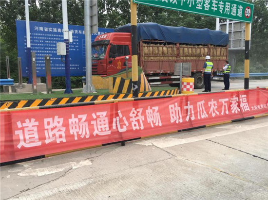 眼下正是瓜果集中上市的季節(jié),為幫助農(nóng)民銷售富有地方品牌特色的優(yōu)質(zhì)西瓜,促進(jìn)當(dāng)?shù)匚鞴辖?jīng)濟(jì)的發(fā)展,扶溝縣大新收費(fèi)站全員出動保暢通,為全國各地拉瓜商販提供便捷服務(wù),為當(dāng)?shù)爻隹诮?jīng)濟(jì)的發(fā)展貢獻(xiàn)一份力量。