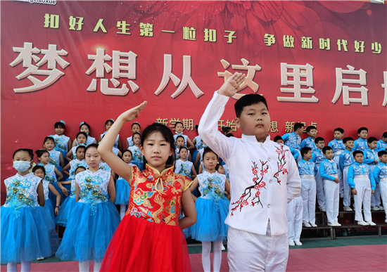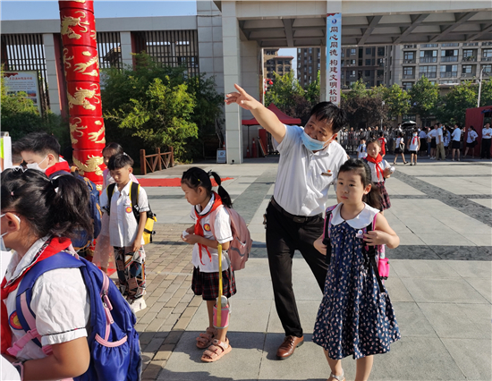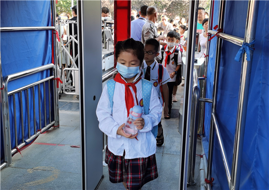 9月7日早上,周口市文昌小學(xué)的學(xué)生有序排隊測量體溫后進入學(xué)校。據(jù)文昌小學(xué)校長介紹,全市中小學(xué)實行錯峰開學(xué)。今天是小學(xué)開學(xué)時間,文昌小學(xué)學(xué)生每個年級實行錯時上下學(xué),學(xué)生入校要測體溫,并為一年級新生舉辦了主題為“夢從這里啟航”的“迎新儀式”。