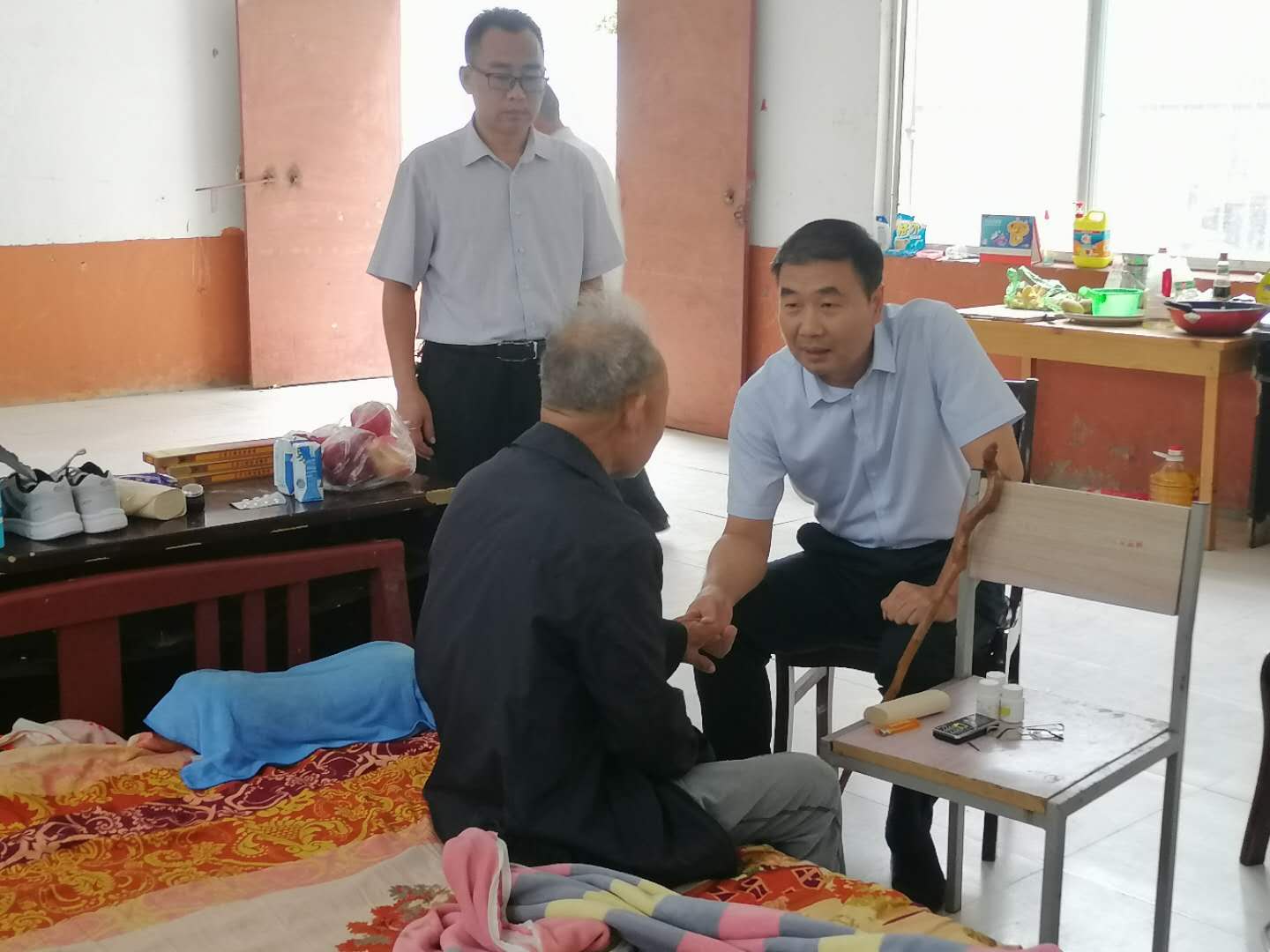 當(dāng)日16時,在三李村村室旁邊的一間房屋內(nèi),孔陽一見到坐在床頭的張殿運,就緊緊拉住他的手,詳細詢問老人吃的什么藥、效果怎么樣、身體恢復(fù)得如何?他叮囑老人:“你保重好身體就是對兒子工作的支持,也是對商水縣扶貧工作的支持。”張殿運說話困難,表達不清,嘴唇顫抖半天也說不出一句話,只是緊緊地握住孔陽的手。得知老人在鹿邑縣宋河鎮(zhèn)農(nóng)村當(dāng)村干部30多年,孔陽稱贊他為黨為民工作一輩子,是好樣的。