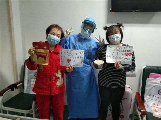 面對新冠肺炎重癥病區(qū)患者心理壓力普遍較大的情況,胡奔奔每天忙完護理工作之余,主動通過談心、跳舞、做游戲等方式對患者進行心理疏導,成為大家的“開心果”,使得病區(qū)氛圍大大改善,有了歡聲笑語。三八節(jié)當天,她為病區(qū)患者送上親手繪制的“奔奔與你同在”簡筆畫,以及家鄉(xiāng)特產牛肉和胡辣湯,為患者加油。見到患者的笑容,成了胡奔奔最開心的事情。