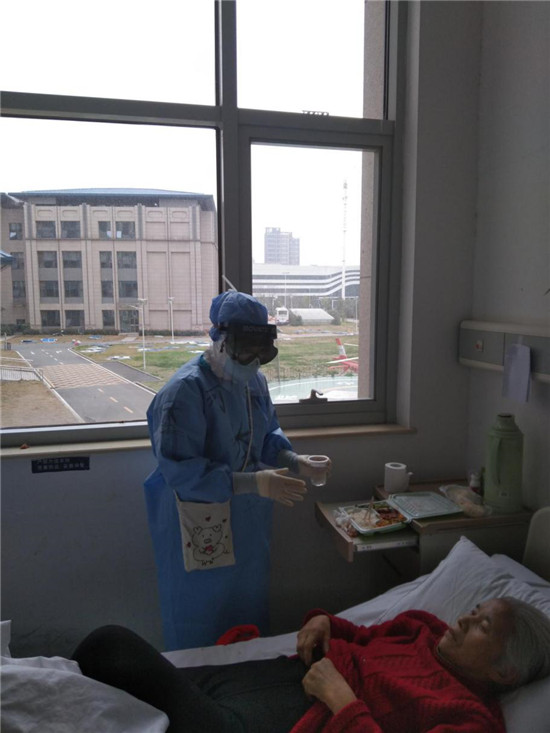 這位老人名叫楊守振,今年84歲,不僅感染新冠肺炎,而且有嚴重的營養(yǎng)不良,插著胃管,身體極為消瘦,生活不能自理。為了不讓老人出現(xiàn)壓瘡,胡奔奔需要每隔一個小時為老人翻一次身。翻身時候,為了讓老人更舒服一點,她每次都像抱孩子一樣把老人抱在懷里,動作輕柔的按摩老人受壓的部位防止壓瘡的形成。貼心照顧之下,老人身體狀況和精神逐漸好轉,每次跟家人視頻聊天的時候,老人都會指著幫她舉著手機的胡奔奔朝手機里的家人顫顫巍巍的豎起大拇指。