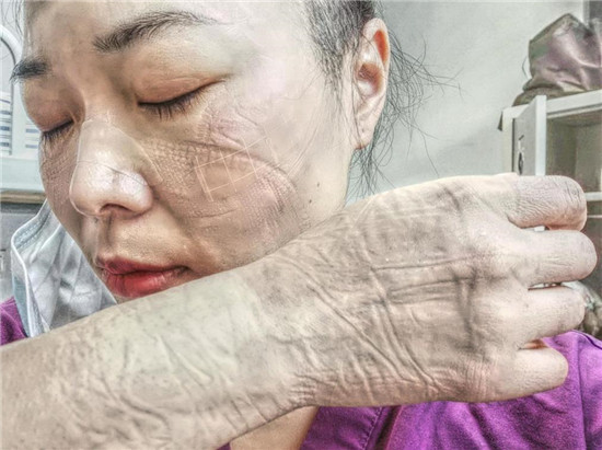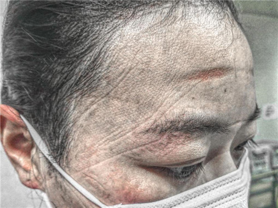 因為新冠肺炎的強傳染性,胡奔奔每次去病區(qū)上班都要全副武裝,而且為保證在6個小時的工作時間內不被暴露,不能去衛(wèi)生間,不能喝水,還要穿上成人紙尿褲以防萬一。這樣下來,汗?jié)褚路浅J?,而且下班后脫掉防護裝備后,她原本清秀白皙的臉上,滿是深深的皺褶,久久難以恢復,惹人心疼。給家人報平安時,胡奔奔甚至不敢視頻聊天,只能語音安慰家人。