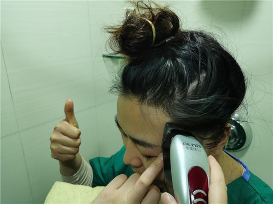 出征武漢之前,為減少感染自己、感染別人的風險,出生于1991年、和同齡人一樣愛美的胡奔奔毅然決定同意剃去一襲披肩長發(fā)。這頭秀發(fā),胡奔奔留了多年,曾經看得跟生命一樣珍貴,但疫情險惡,她義無反顧。