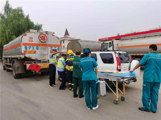 當(dāng)日上午10時(shí),商水交警大隊(duì)指揮中心接到報(bào)警:在商水縣興商大道與陳勝大道交叉口西、湯莊油庫處,一輛轎車與一輛?;饭捃囎肺蚕嘧?,正常罐體損壞,?;沸孤镀鸹穑I車駕駛室變形,駕駛?cè)吮焕к噧?nèi),如不及時(shí)救援,駕駛?cè)擞猩kU(xiǎn),另外因事故現(xiàn)場臨近湯莊油庫,如不及時(shí)處置可能發(fā)生爆炸,后果不堪設(shè)想。