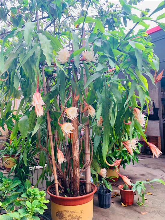 在周口市中心城區(qū)的一個(gè)家屬院里,記者見(jiàn)到了88歲的苗天才和他養(yǎng)的曇花,“一株21年樹(shù)齡的曇花開(kāi)了43朵,另外兩株5年樹(shù)齡的曇花加起來(lái)開(kāi)了13朵,這3株曇花一共開(kāi)了56朵。”苗天才說(shuō),早上四五點(diǎn)的時(shí)候曇花就慢慢地開(kāi)放了,到現(xiàn)在五六個(gè)小時(shí)過(guò)去了曇花還保持著開(kāi)放狀態(tài)。