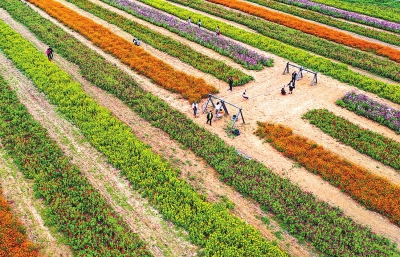 “十一”假期,游客在寧陵縣邏崗鎮(zhèn)黃老家村花海中賞花。該村打造生態(tài)花田小鎮(zhèn),吸引了眾多游客前來拍照游玩,有力提高了當?shù)卮迕袷杖?。呂忠箱攝