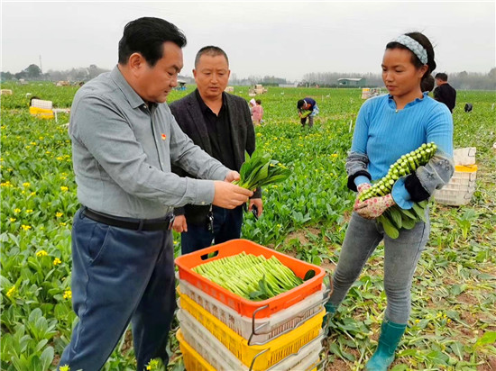 在張集鎮(zhèn)景鴻蔬菜種植基地,王國(guó)璽與正在干活的群眾親切交談,進(jìn)菜地、看長(zhǎng)勢(shì)、問(wèn)產(chǎn)量,詳細(xì)了解產(chǎn)業(yè)規(guī)劃建設(shè)、政策落實(shí)、發(fā)展規(guī)模、運(yùn)營(yíng)模式、產(chǎn)品銷(xiāo)路、帶貧成效等具體做法和經(jīng)驗(yàn)。王國(guó)璽指出,在疫情防控常態(tài)化下,鄉(xiāng)賢有效利用資本市場(chǎng),與家鄉(xiāng)勞動(dòng)力資源、土地資源有效銜接,發(fā)揮產(chǎn)品優(yōu)勢(shì),增加群眾收入,鞏固了脫貧成果,為鄉(xiāng)村振興打下了堅(jiān)實(shí)基礎(chǔ),要做好宣傳推廣和經(jīng)驗(yàn)總結(jié)。