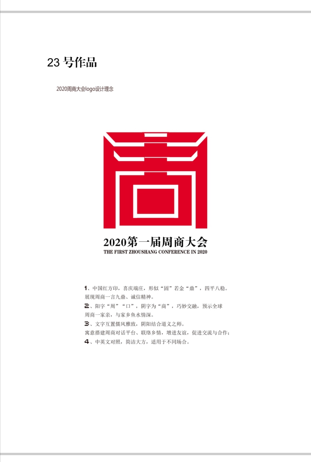 自11月12日起面向社會(huì)公開征集第一屆周商大會(huì)主題會(huì)標(biāo),截至11月19日24:00時(shí),大會(huì)工作組共征集到來自10個(gè)省轄市的作品67件。11月20日上午10:00時(shí),對(duì)作品進(jìn)行統(tǒng)一編號(hào)后,經(jīng)專家評(píng)審團(tuán)評(píng)審出55幅進(jìn)入評(píng)選,經(jīng)逐項(xiàng)打分初評(píng)出6件作品,最后按綜合得分前三名作品入圍。
