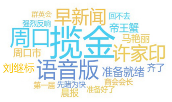 網(wǎng)絡熱詞反映了網(wǎng)民關(guān)注的重點,詞云圖中大大的“攬金”二字占據(jù)詞云圖中央,可見攬金是真的攬金,據(jù)悉,首屆周商大會簽約項目31個,總投資達429.7億元人民幣?!霸S家印”“馬艷麗”在整個圖中也是光彩奪目,作為周口人,走上北上廣深的成功人士還心心念念家鄉(xiāng)的發(fā)展,讓老鄉(xiāng)們倍感溫暖,家鄉(xiāng)人關(guān)注他們?yōu)榧亦l(xiāng)發(fā)展做出的努力和他們的動態(tài)也是再正常不過了。