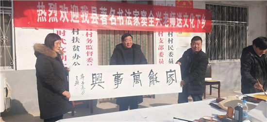 為弘揚(yáng)傳統(tǒng)文化,傳播正能量,助力農(nóng)村文化建設(shè),12月16日,沈丘縣自然資源局駐村工作隊(duì)邀請(qǐng)沈丘縣書(shū)法家竇全興老師到石槽集鄉(xiāng)于營(yíng)行政村開(kāi)展送文化下鄉(xiāng)活動(dòng),為廣大群眾送去“文化大餐”。