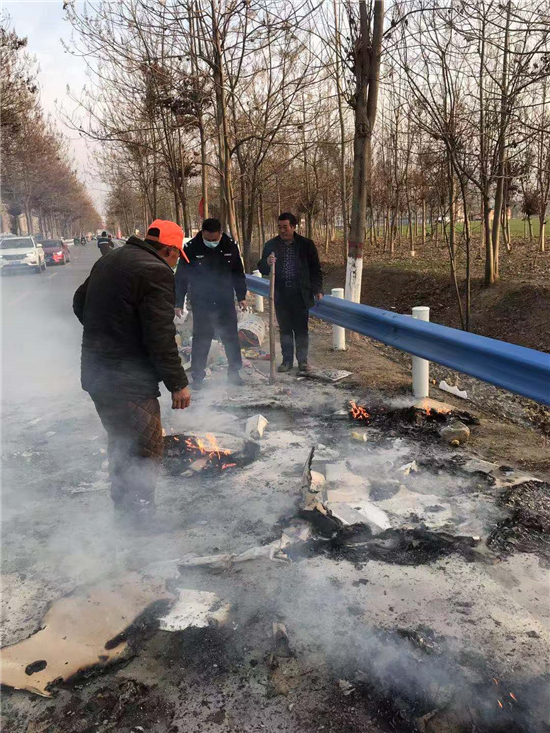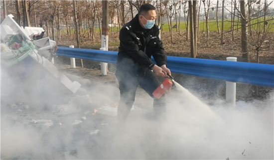 當(dāng)日下午4點(diǎn)左右,太康縣交警大隊二中隊指導(dǎo)員南應(yīng)開及輔警郭旗全、魯?shù)?、尹晨豪正在趙堂村附近巡邏時,猛然看到前方一輛電動三輪車上有煙氣冒出,巡邏民警加速趕到。原來是一名老漢的一輛拉著廢舊紙箱的電動三輪車著了火,一車廢紙和塑料瓶散落一地正在燃燒,火越燒越旺,只見老漢正在手忙腳亂地滅火。這輛三輪車上拉的全是廢塑料、硬紙殼等易燃物,而且當(dāng)時正刮著風(fēng),如果不及時滅火任由火勢蔓延,后果將不堪設(shè)想??吹酱饲闆r后,南應(yīng)開迅速從警車上拿出滅火器秒變“消防員”,對著起火的物品進(jìn)行滅火操作,同時安排輔警對過往行人和車輛進(jìn)行疏導(dǎo)。由于發(fā)現(xiàn)和撲救及時,在民警的緊急救援下,火源很快被眾人合力撲滅。對太康交警面對火情臨危不亂、果斷處置、幫助群眾的行為,老漢車主和過往群眾紛紛點(diǎn)贊。②6