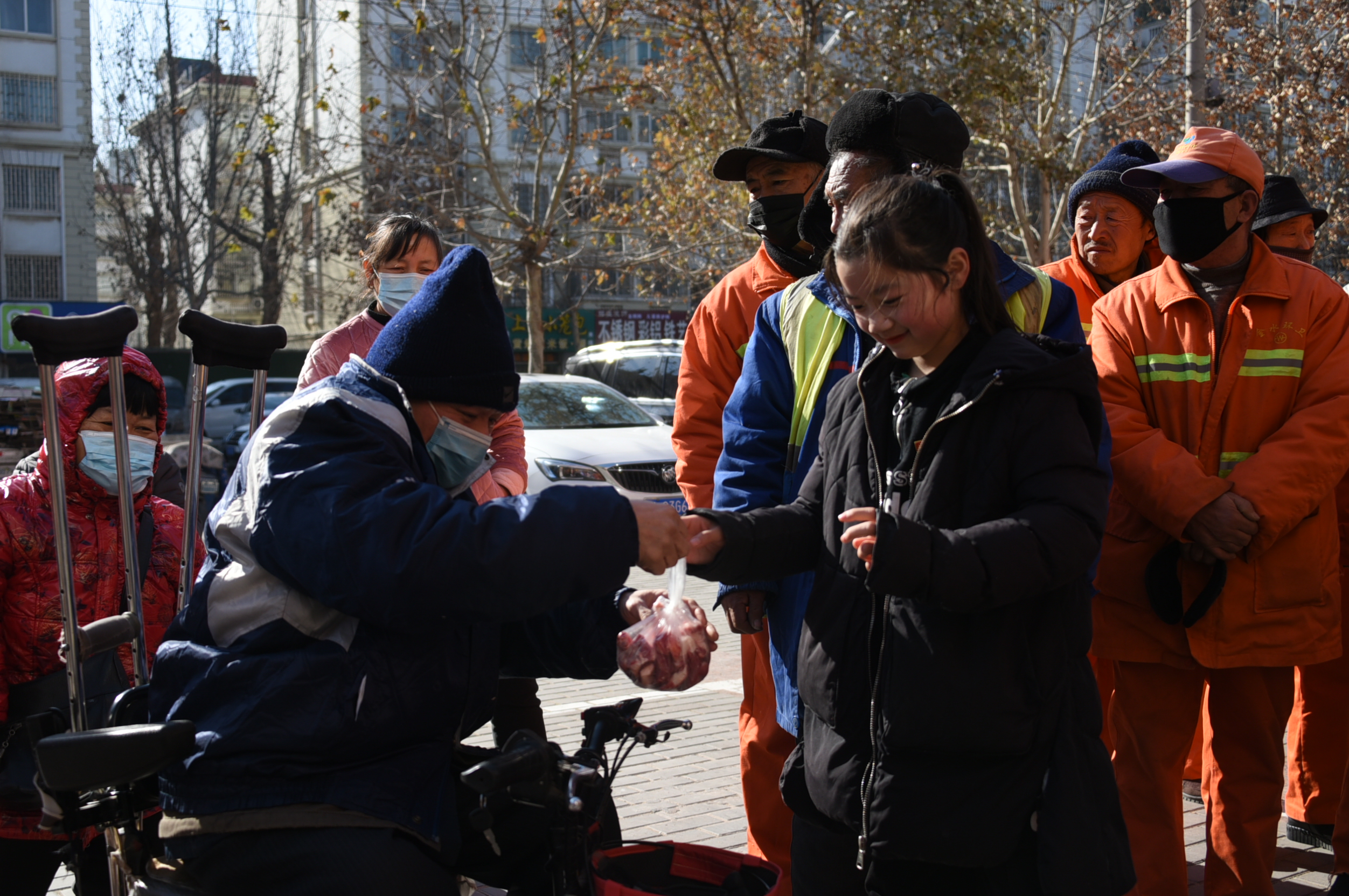 在現(xiàn)場分派羊肉的店老板陳峰稱,此次現(xiàn)場將為到場的環(huán)衛(wèi)工人、殘疾人朋友派發(fā)30多份,一些行動不便的困難家庭,他們隨后將登門相送?!耙粋€人做一件好事不難,難的就是十幾年的堅持?!币幻麣埣踩伺笥焉斐龃竽粗刚f到。