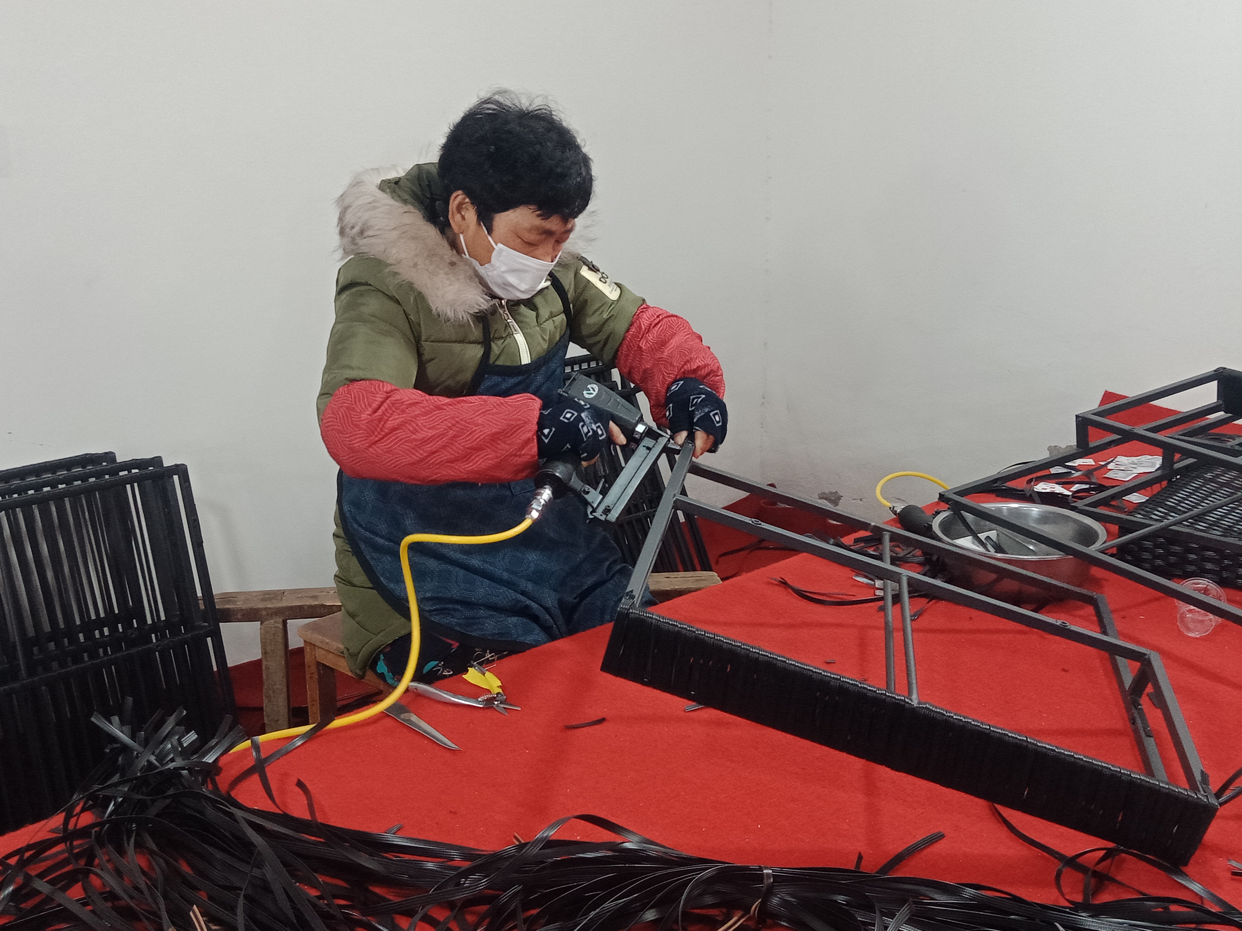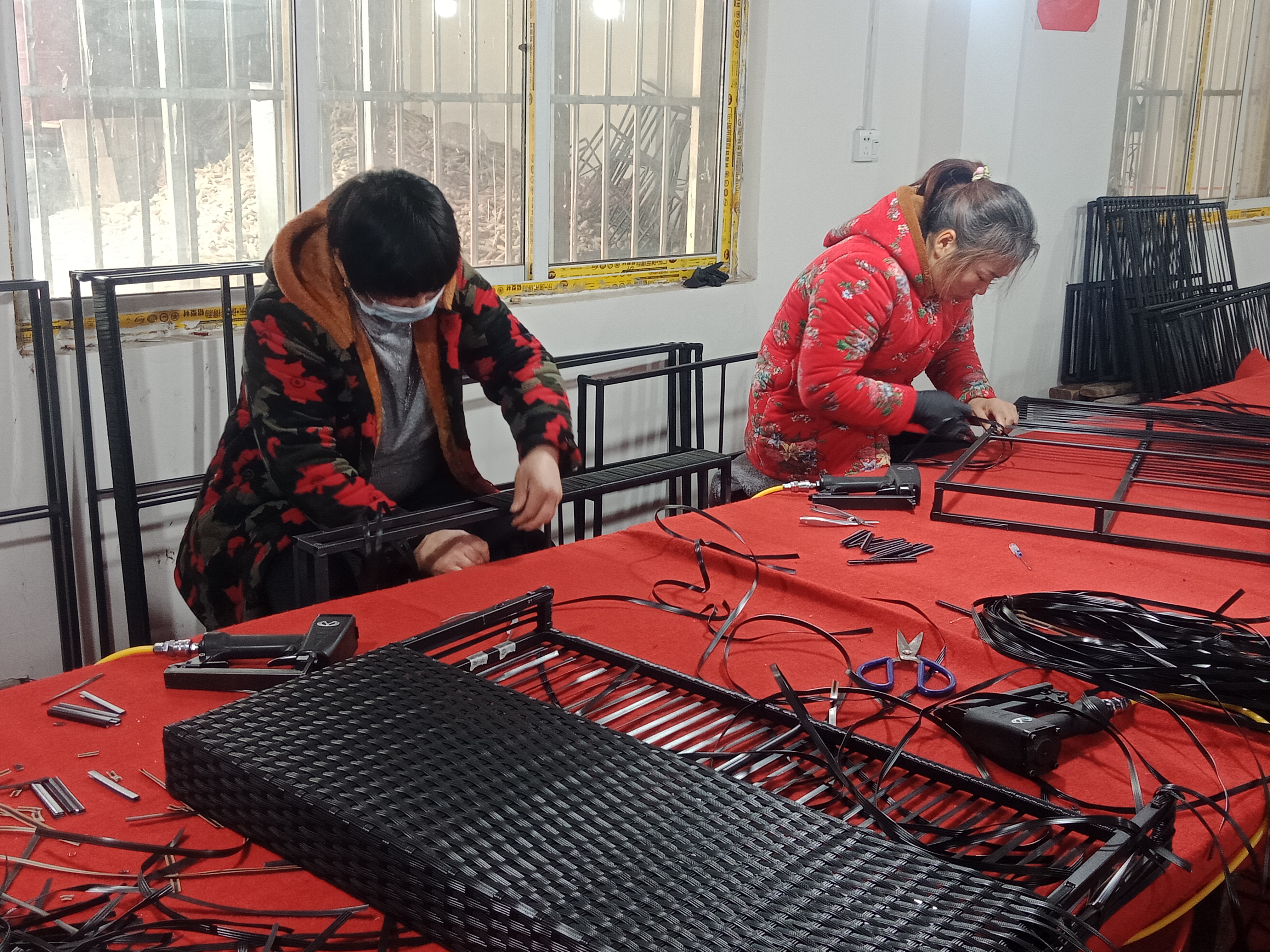 在加工車間,記者看到十幾個中年婦女在不停忙碌著。有拉鋼的、有編織的,有收尾的,顯得很是輕松愉快。據(jù)說,熟練工每天可以加工十多個戶外藤編沙發(fā)雙面靠背,按件計算,平均每天能掙六七十元,多的可掙百元。