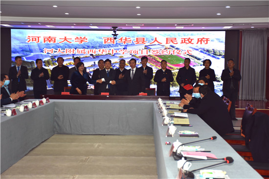 在與會領(lǐng)導(dǎo)的共同見證下,西華縣委副書記、縣長田慶杰與河南大學(xué)黨委常委、副校長許紹康簽訂戰(zhàn)略合作協(xié)議書;西華縣經(jīng)濟技術(shù)開發(fā)區(qū)管委會主任宋廣良,河南大學(xué)附屬中學(xué)校長蔡建東,河南博遠教育投資有限公司董事長樊元玲共同簽訂河南大學(xué)附屬西華中學(xué)項目協(xié)議。