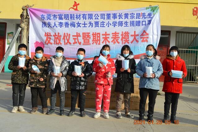 廣東省東莞市富明鞋材有限公司董事長黃宗昆先生及夫人李香梅女士原籍太康縣馬頭鎮(zhèn)薛廟村,他們得知寒假將至,正值師生、家長返鄉(xiāng)團(tuán)聚、走親訪友高峰時(shí)節(jié),當(dāng)前疫情防控面臨境外疫情持續(xù)爆發(fā)流行、國內(nèi)散發(fā)病例頻發(fā)的新情況、新挑戰(zhàn)。為了確保賈莊小學(xué)300多名師生生命安全和身心健康,以及他們近期疫情防控對口罩的需求,進(jìn)一步增強(qiáng)師生的防控意識,夫妻二人決定為該校捐贈(zèng)3萬只一次性醫(yī)用口罩,以實(shí)際行動(dòng)助力該校疫情防控工作。