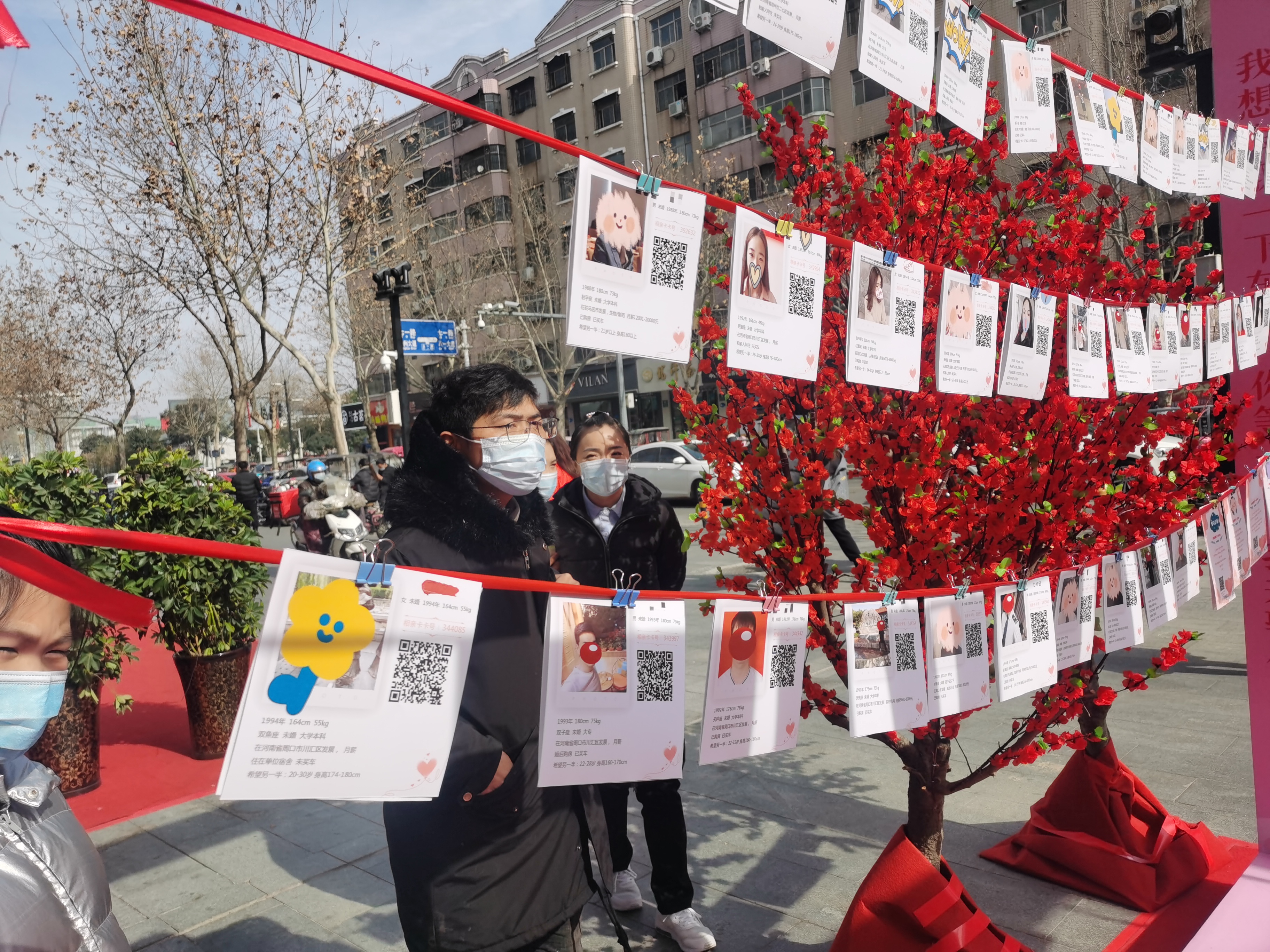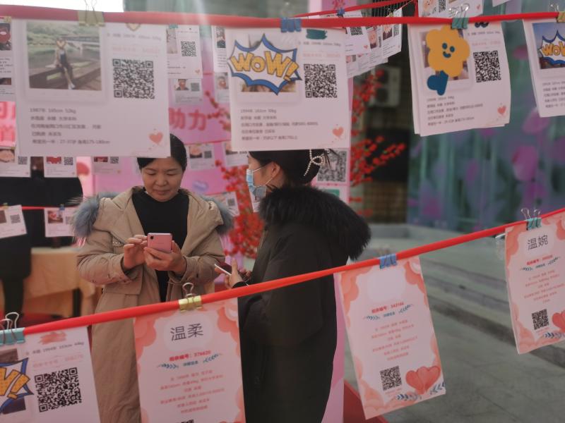 2月6日,不少市民在位于五一路與七一路交叉口的愛(ài)的茂商場(chǎng)門(mén)口的相親角駐足觀看,了解情況。