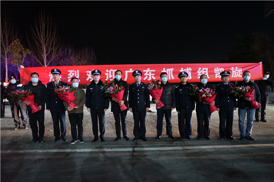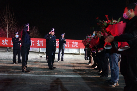 英雄凱旋,鮮花致敬。2月6日夜晚11時(shí)許,寧洛高速項(xiàng)城北收費(fèi)站警燈閃爍、隊(duì)列整齊,項(xiàng)城市公安局在這里隆重舉行儀式,熱烈歡迎 “1.8”專(zhuān)案組民警勝利歸來(lái)。副市長(zhǎng)、公安局長(zhǎng)萬(wàn)東偉,局黨委副書(shū)記、副局長(zhǎng)陳重,局黨委委員、政辦室主任衛(wèi)偉,局黨委委員袁啟峰等領(lǐng)導(dǎo)出席儀式,部分民警代表參加了儀式。萬(wàn)東偉同志代表局黨委對(duì)此案的成功偵破表示熱烈祝賀,真誠(chéng)感謝專(zhuān)案組民警的辛勤付出,并向大家致以崇高的敬意。