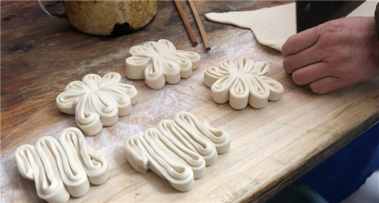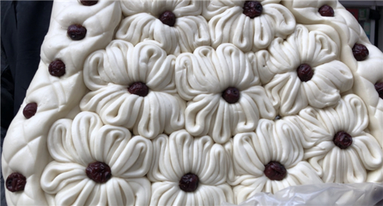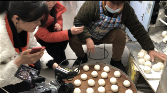 除了平常的白面饅頭,黃師傅還讓妻子現(xiàn)場展示了“棗山”制作,并介紹了棗山的寓意和習(xí)俗。“你看這棗山是一層一層的,寓意著步步登高,而且棗山的花形是圓的,代表著團(tuán)團(tuán)圓圓。過去出嫁的閨女過年回娘家要帶大饃,娘家要回棗山,現(xiàn)在咱們周口的一些地方還保留著這樣的習(xí)俗。”兩位主播體驗(yàn)了棗山的制作過程,得到黃老板妻子的夸獎(jiǎng):“中!這倆妮兒可巧!”