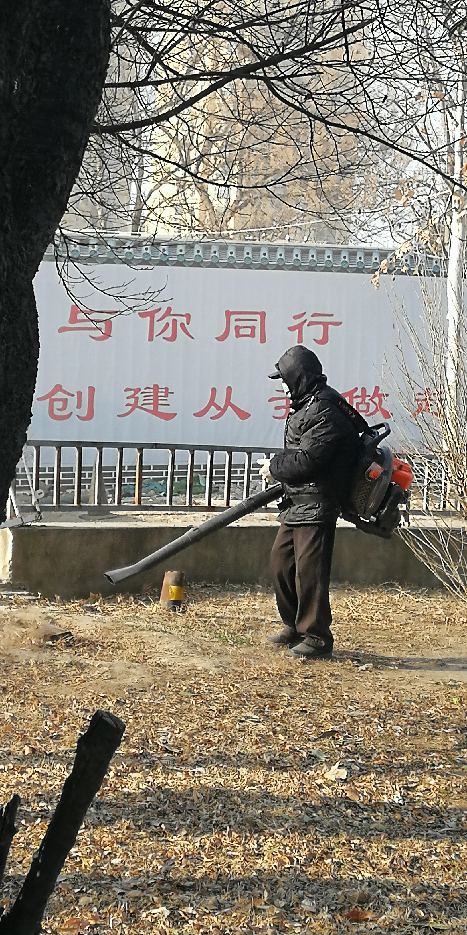 2月11日,大年三十。在川匯區(qū)濱河路上,工作人員背著吹風(fēng)機(jī)清理游園內(nèi)的落葉和垃圾。工作人員介紹,這樣便于更快更好地工作。(周口日?qǐng)?bào)·周道客戶(hù)端記者 馬月紅)②7