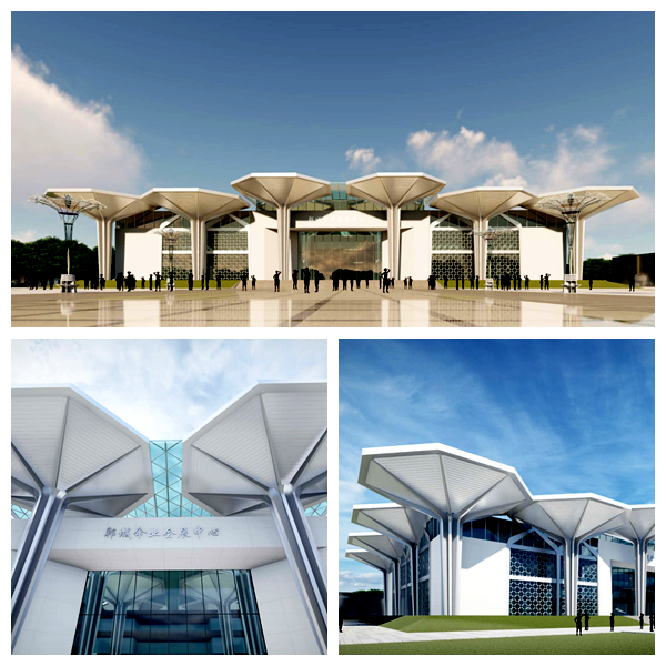 其中,傘業(yè)產(chǎn)業(yè)園電子商務服務中心項目由中國一冶承建,會展中心的設計概念以“傘啟鄲興”為主題,基于對本土特色文化的深入解讀、同時結(jié)合“傘”的具體特征,提煉傘蓋、傘骨、傘柄的特殊形象為基本元素。建筑主立面以八個巨大傘形構(gòu)架依次展開,巨型的尺度、新穎的造型有極強的昭示性,裝飾幕墻八邊形的單元分割也隱喻了傘蓋的造型,創(chuàng)新的視覺形象為傘業(yè)產(chǎn)業(yè)園增加了新的注解。會展中心整體的建筑風格充分展示了鄲城傘業(yè)產(chǎn)業(yè)園的核心價值,形成獨具特色的地標形象。