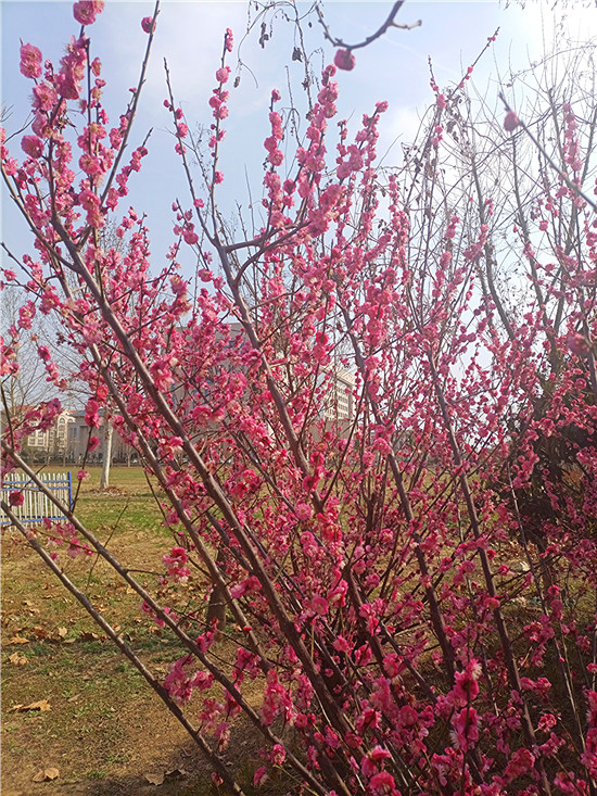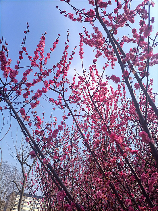 梅花,自古以來就是文人墨客筆下的??汀S性娫疲骸按猴L(fēng)試手先梅蕊,頩姿冷艷明沙水?!泵坊軌蛄韬㈤_,兼具冷艷和嬌媚,被譽為花中四君子之首。近日,我市天氣晴好,公園內(nèi)、道路旁,一樹樹梅花開的熱熱鬧鬧、密密匝匝,令人感受到濃濃的春意和無盡的美好。