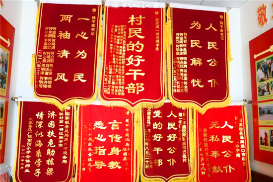 路修好了,村民為韓宇南送來了第一面錦旗。在以后的幾年里,群眾多次自發(fā)給韓宇南送來錦旗,近40面錦旗重重疊疊掛滿了村委會(huì)的整個(gè)北墻。