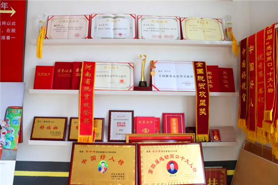 “這是村里自發(fā)給韓書記送的第一面錦旗?!痹谇昂涡姓宕逦瘯?huì)榮譽(yù)室的北墻上掛著30多面錦旗,其中一面錦旗上寫著“人民好公仆、黨的好干部”,說起這面錦旗的故事,村干部何金龍顯得很激動(dòng)。