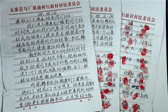 2018年,組織上考慮到韓宇南已經(jīng)在第一書記的崗位上工作了3年多,決定換他回原單位工作。前何村的群眾聽到這個(gè)消息后,多次前往馬廠鎮(zhèn)政府請?jiān)?,要求留下韓宇南繼續(xù)擔(dān)任前河村支部書記,何心功等99位村民還向國家稅務(wù)總局周口市稅務(wù)局、太康縣委縣政府寫了一封“挽留信”,并按下了99個(gè)鮮紅的手印。