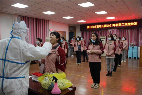 為保證市直幼兒園順利開(kāi)學(xué),按照市教體局統(tǒng)一安排部署,近日,周口市婦女兒童醫(yī)院核酸檢測(cè)組對(duì)市直幼兒園全體教職工百余人順利進(jìn)行了新冠肺炎核酸檢測(cè),檢測(cè)結(jié)果在校老師全部健康,無(wú)異常。圖為市直幼兒園教職工在進(jìn)行新冠肺炎核酸檢測(cè)。